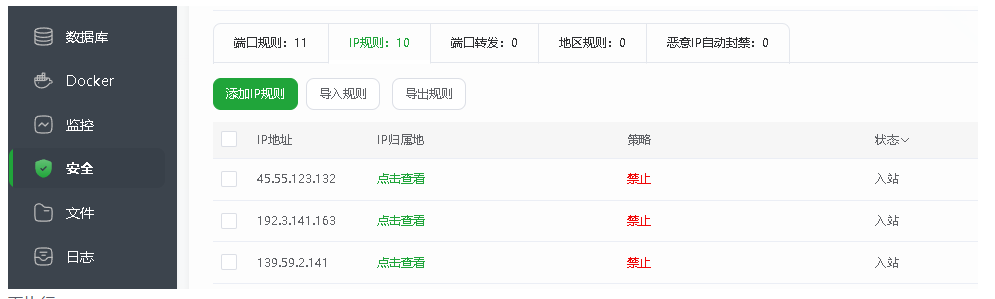 3、宝塔安全IP规则把三个IP禁用(139.59.2.141 45.55.123.132 192.3.141.163)